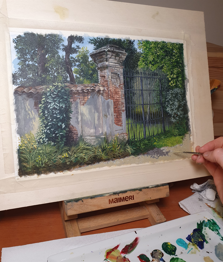 I took the reference photo at a local park where I love to walk my dog. I was inspired by the old, worn brickwork and the evocative iron gate. This piece challenged me from the very start - I had to figure out how to depict atmospheric depth convincingly and am still working on the grass in the foreground.